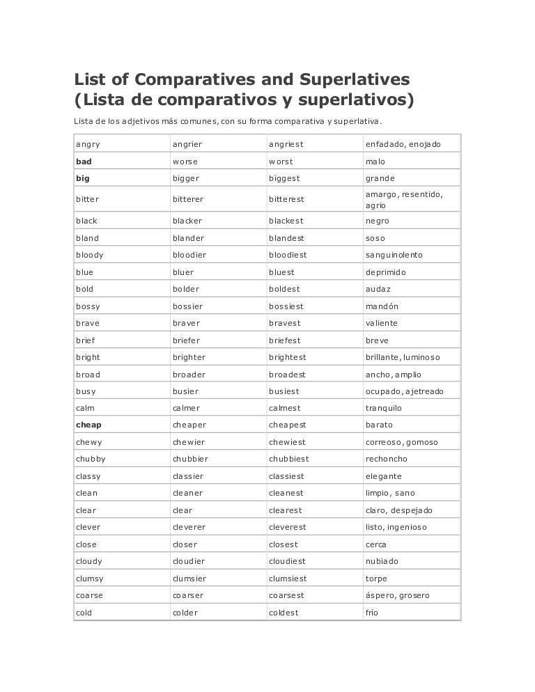 List of adjectives: comparatives and superlatives ... from en.islcollective.com For most important comparative and superlative adjectives list; Comparative and superlative adjectives other contents: Change the adjective into an adverb when necessary. Pdf adjectives comparatives and superlatives list edwin rozo academia edu the lesson contains a grammar review and exercise based on comparative and superlative adjective forms as well as an exercise about using comparatives and superlatives in questions. If the adjective has a cvc pattern, C+v+c = doubles last consonant fat big fatter than bigger than 4. Englishentry soft blando,suave softer softest soon pronto sooner soonest sore dolorido sorer sorest sorry lamentable sorrier sorriest sour agrio,ácido sourer sourest spicy picante,especiado,sazonado spicier spiciest steep Comparatives and superlatives interactive and downloadable worksheet check your answers online or comparativos en ingles ejercicios de ingles hojas de calculo.
